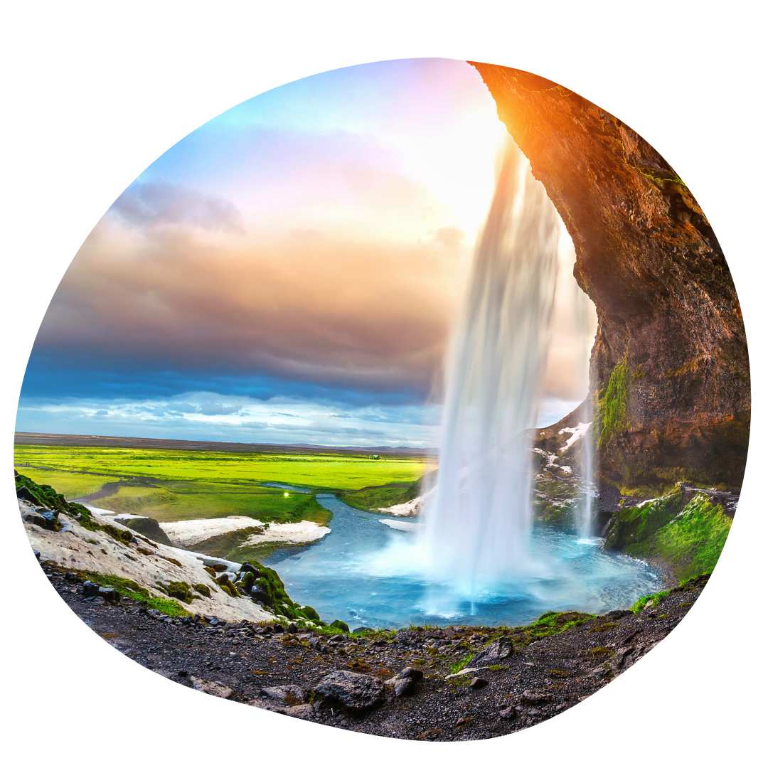 Seljalandsfoss Waterfall – The majestic Seljalandsfoss waterfall invites families to experience the thrill of nature up close. A unique feature allows you to walk behind the waterfall curtain, creating an unforgettable moment for your little adventurers.